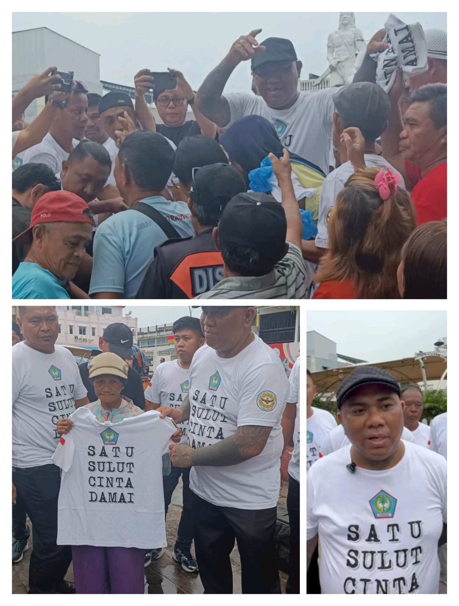 “Kami datang kesini untuk berbagi kasih dengan masyarakat dalam rangka HUT Provinsi Sulawesi Utara ke 61. Dan membagikan kaos yang bertuliskan Satu Sulut Cinta Damai. Karena itu slogan dari Bapak Gubernur Yulius Selvanus,” beber Tonaas Ishak Tambani.